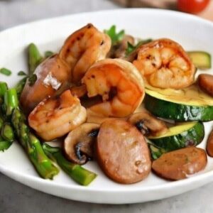 Juicy shrimp, smoky sausage, crisp asparagus, earthy mushrooms, and zucchini all tossed in a fragrant blend of paprika, garlic, onion, thyme, and a kick of cayenne.